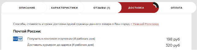 Мы реализовали идею клиента с показом только двух вариантов — самых недорогих тарифов с доставкой в почтовое отделение и курьером. Кроме того, внесли изменения в карточку товара, в которой также происходит предварительная оценка стоимости доставки, и на страницу оформленного заказа.
