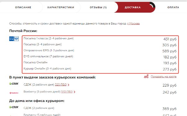 Но при клике по псевдоссылке «Тарифы» можно развернуть все тарифы конкретной группы и выбрать иной почтовый тариф. В основном такой возможностью будут пользоваться менеджеры, но если и обычный покупатель сознательно изменит тариф, это не будет проблемой. Большинство же покупателей не станут вникать в сложную систему и выберут либо доставку до почтового отделения, либо доставку курьером.