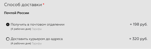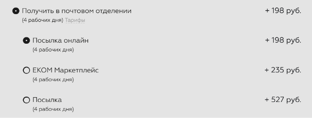 Доставку в почтовое отделение и доставку курьером сделали группой тарифов, внутри которых скрывались конкретные почтовые тарифы. Визуально группа почти ничем не отличается от одного из тарифов, поэтому для пользователей интерфейс остался привычным и интуитивно понятным.